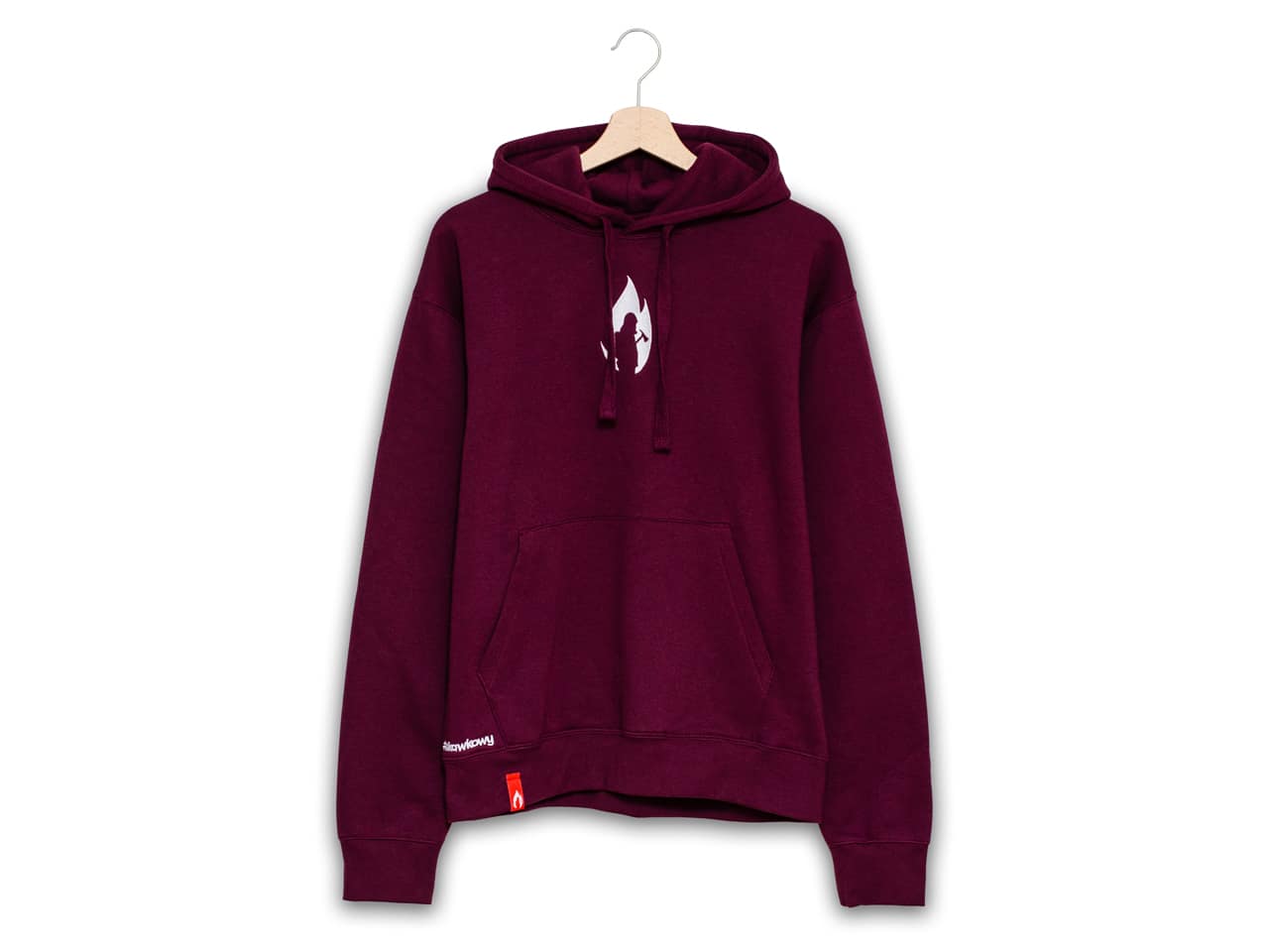 Bluza strażacka w przepięknym, unikalnym, burgundowym kolorze. Na środku bluzy wyhaftowane logo Sikawkowy w kolorze białym. Na dole bluzy wykonany również metodą haftu napis #sikawkowy.