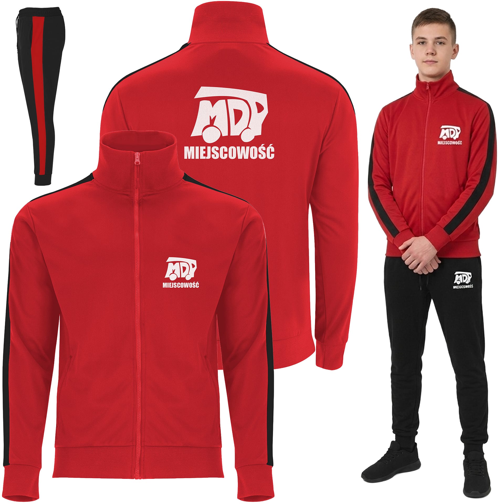 - personalizacja: nadruk z logo MDP + miejscowość na plecach, piersi i lewej nogawce spodni
