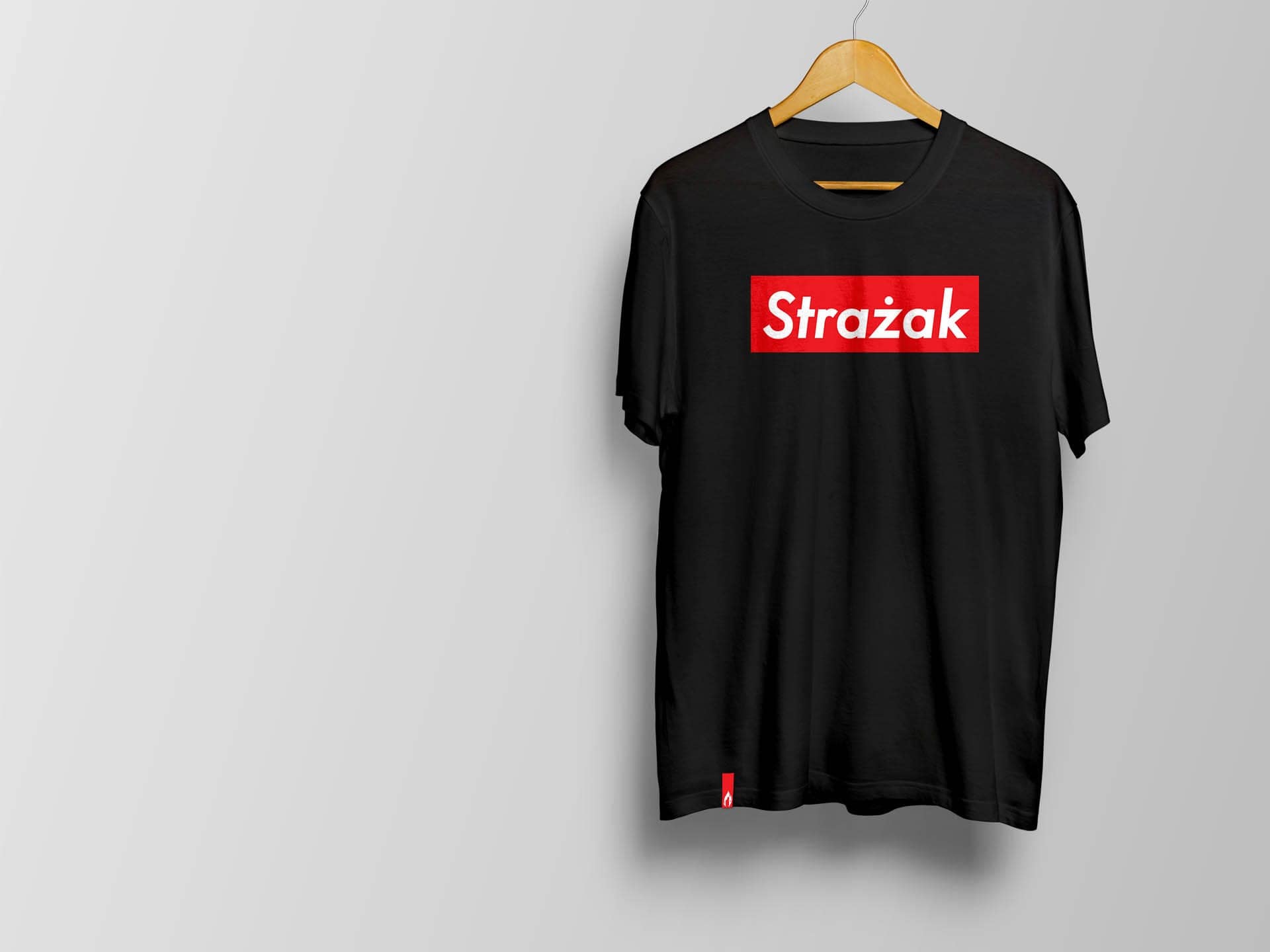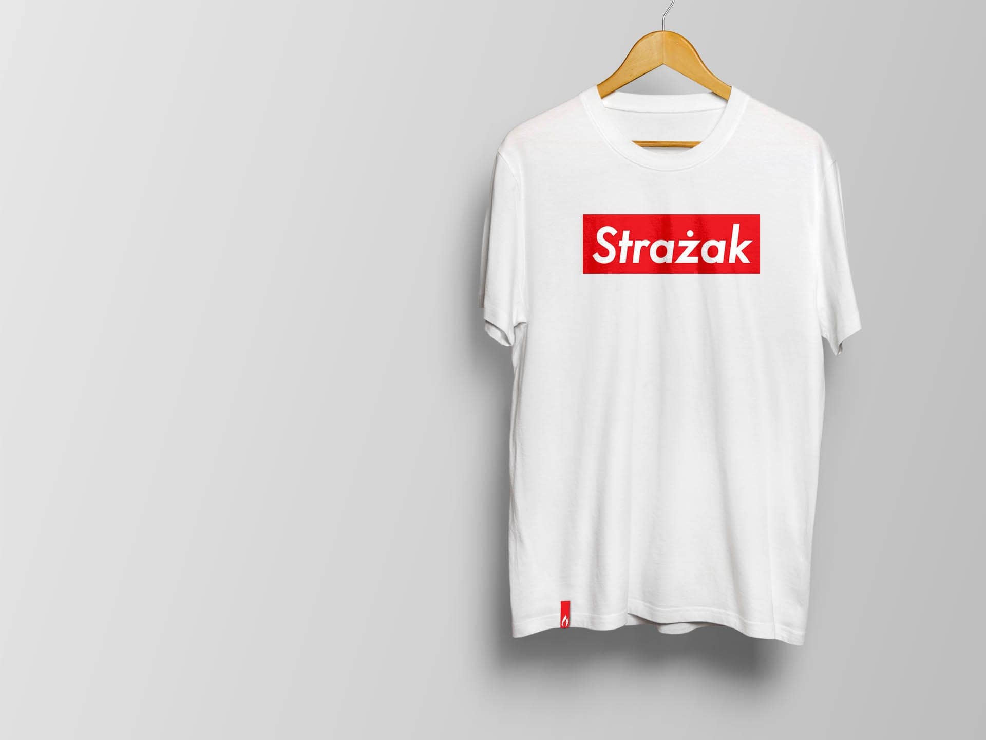 Koszulka z białym napisem Strażak na czerwonym prostokącie. Prostota formy i przekazu czyni tą koszulkę dobrym wyborem do codziennego użytku.