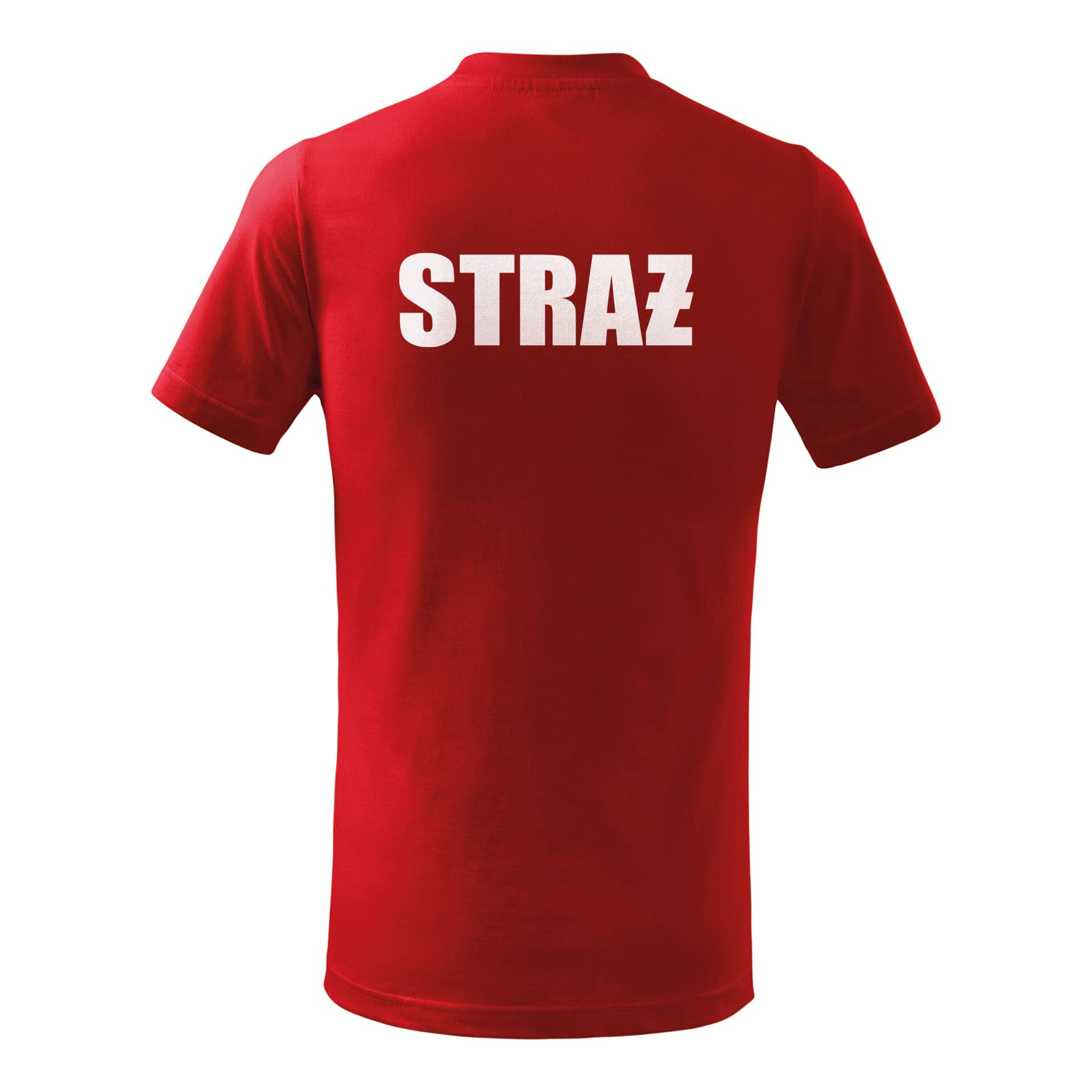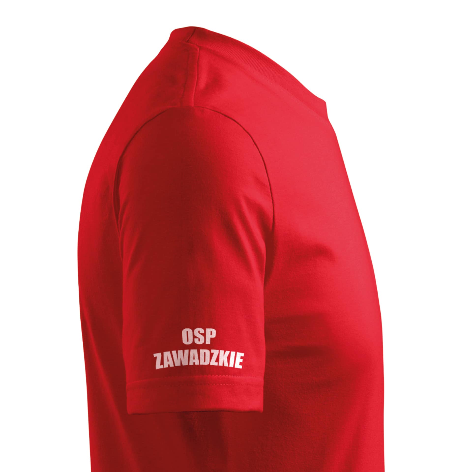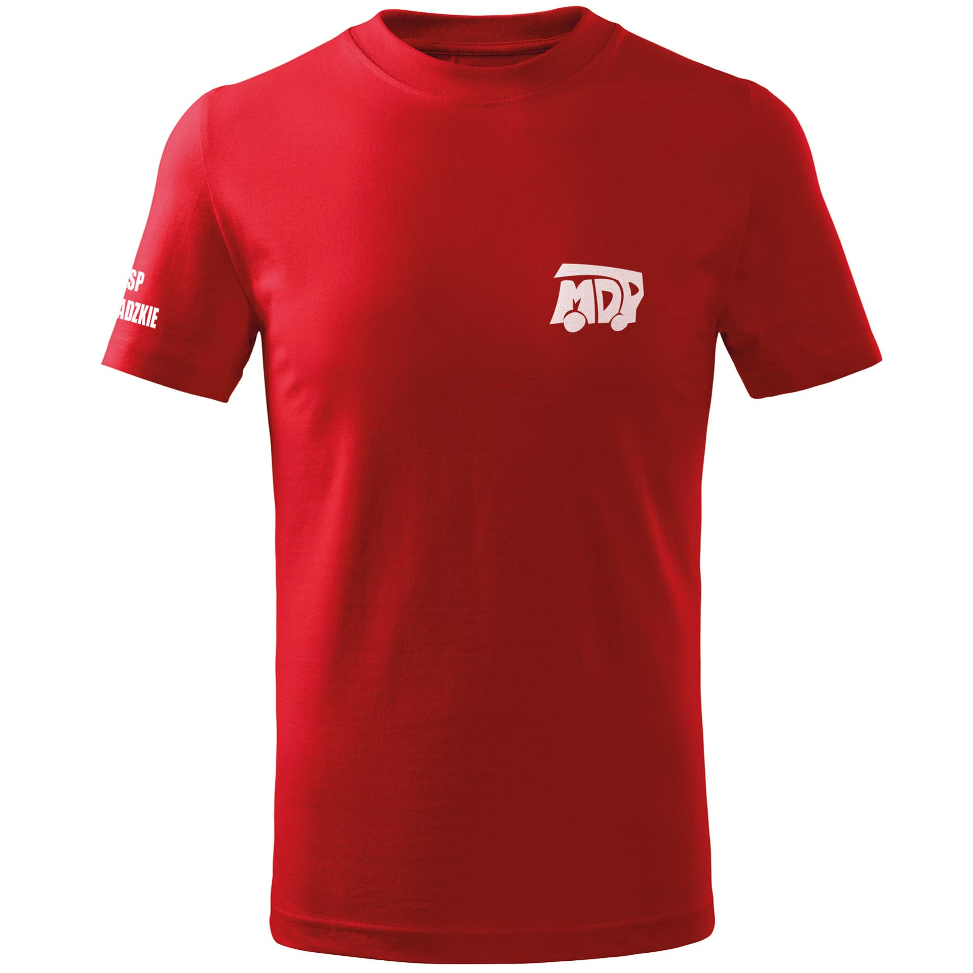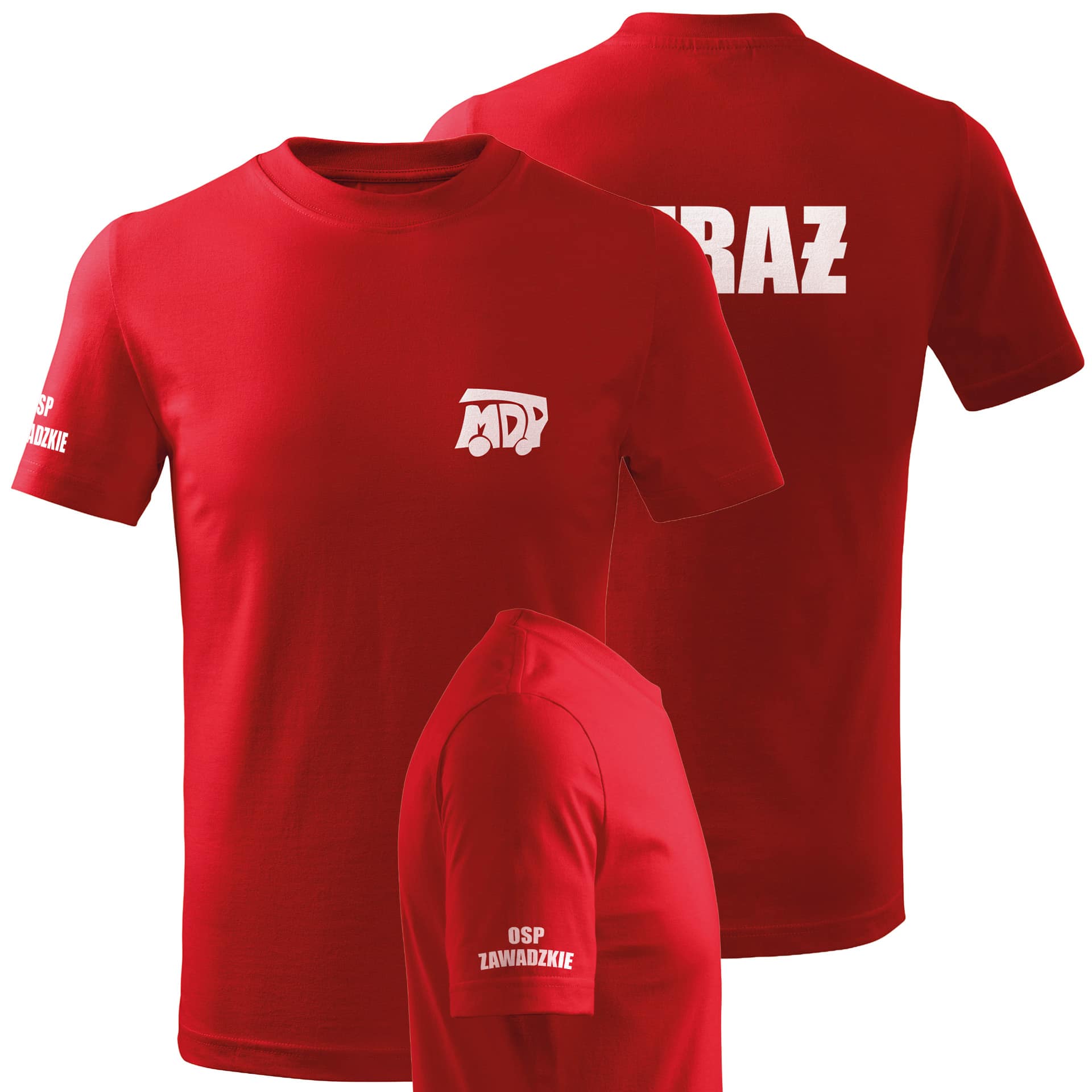 Koszulka strażacka MDP czerwona wykonana z wysokiej jakości bawełny o gramaturze 155 g/m2 z nadrukiem z folii flex w kolorze białym.