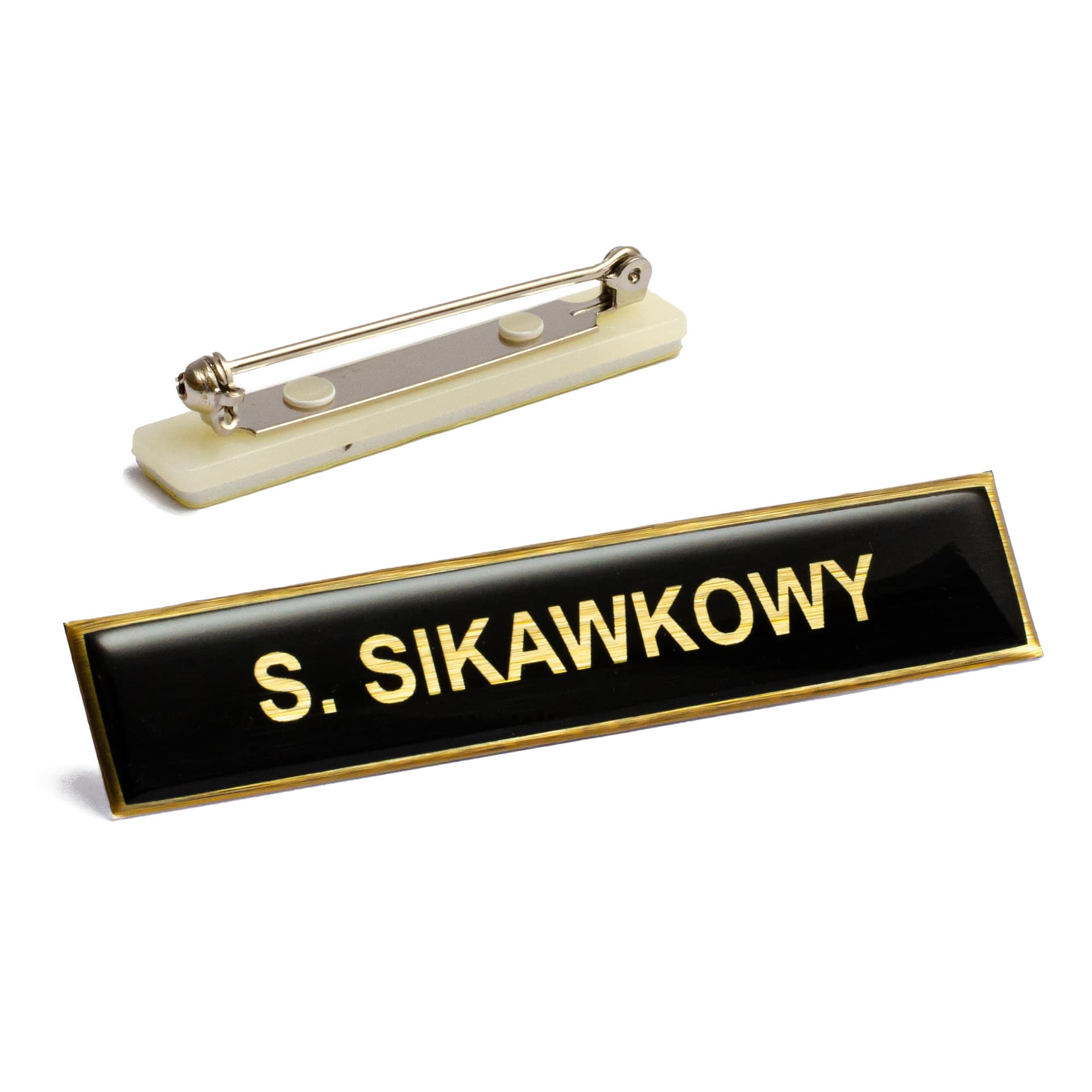 - Wymiary – szerokość 16 mm, długość od 77 do 100 mm (w zależności od długości nazwiska – standardowo 80 mm.). Ramka wokół o szerokości 1,5 mm. Grubość przezroczystej żywicy polimerowej około 1 mm