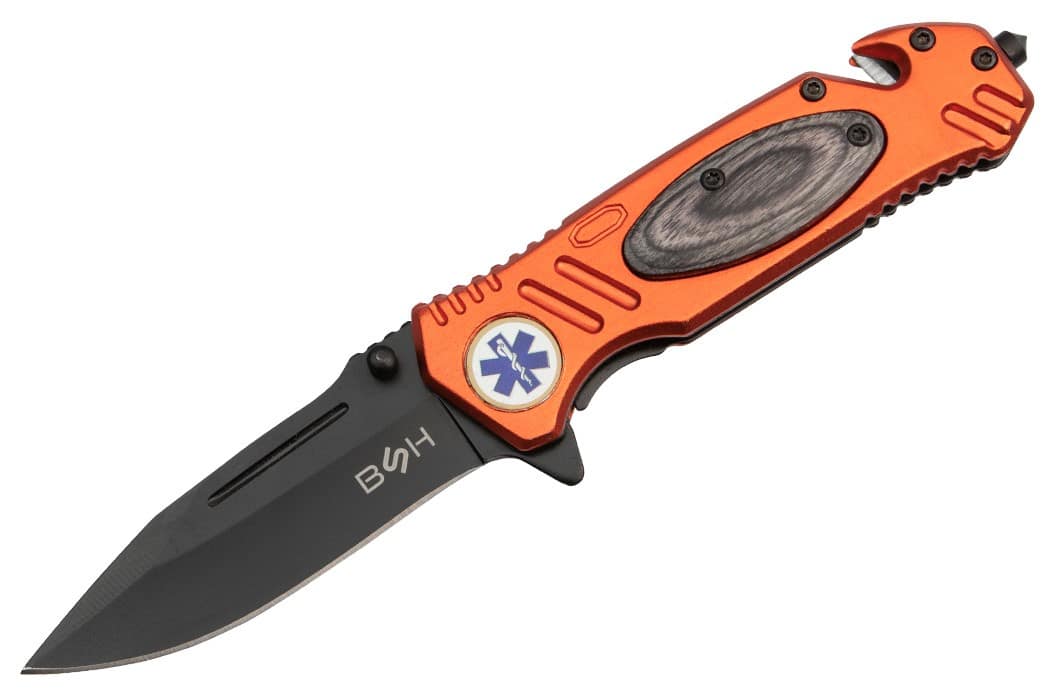 ✅ Nóż sprężynowy jest utrzymany w stylistyce ratunkowej, posiada odblaskowe, pomarańczowe okucia z aluminium oraz gwiazdę życia.