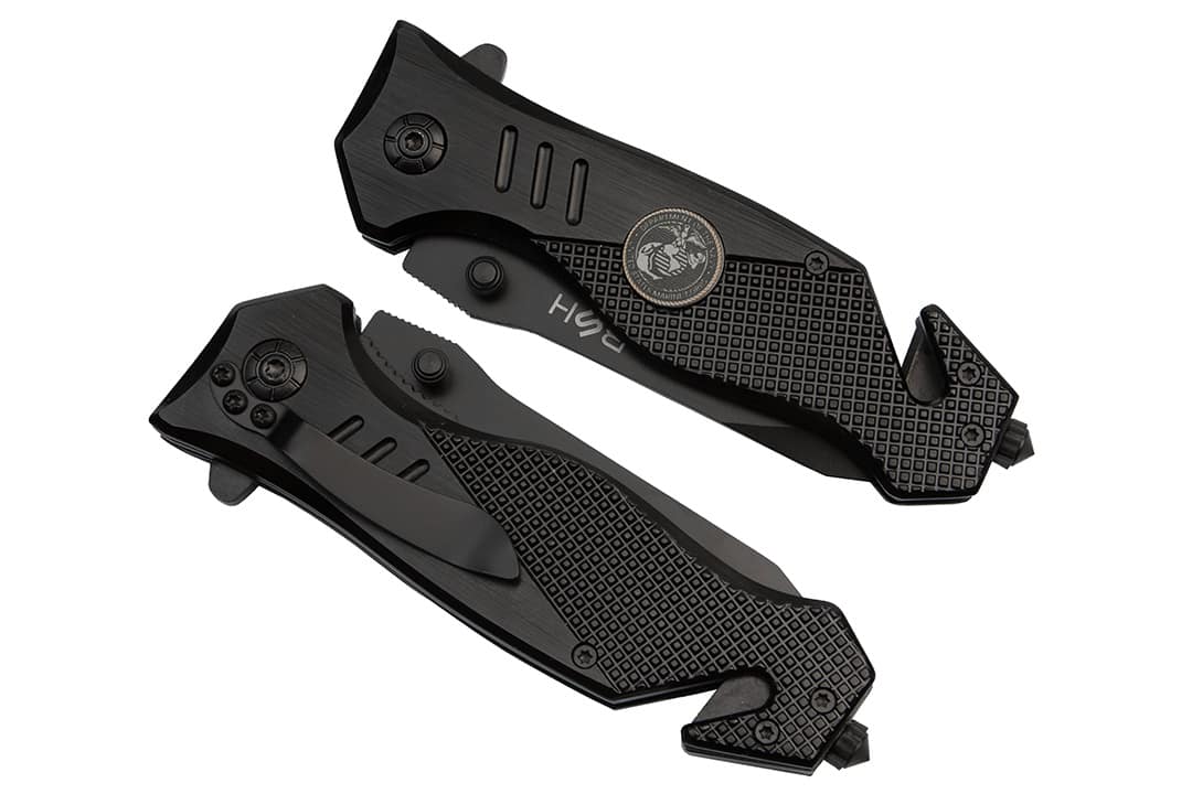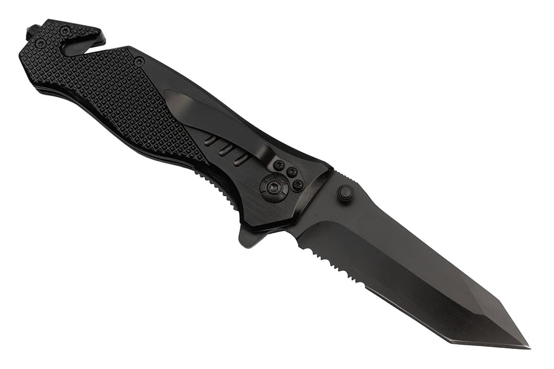 Składany nóż został wyposażony w niezbędne elementy ratownicze takie jak: